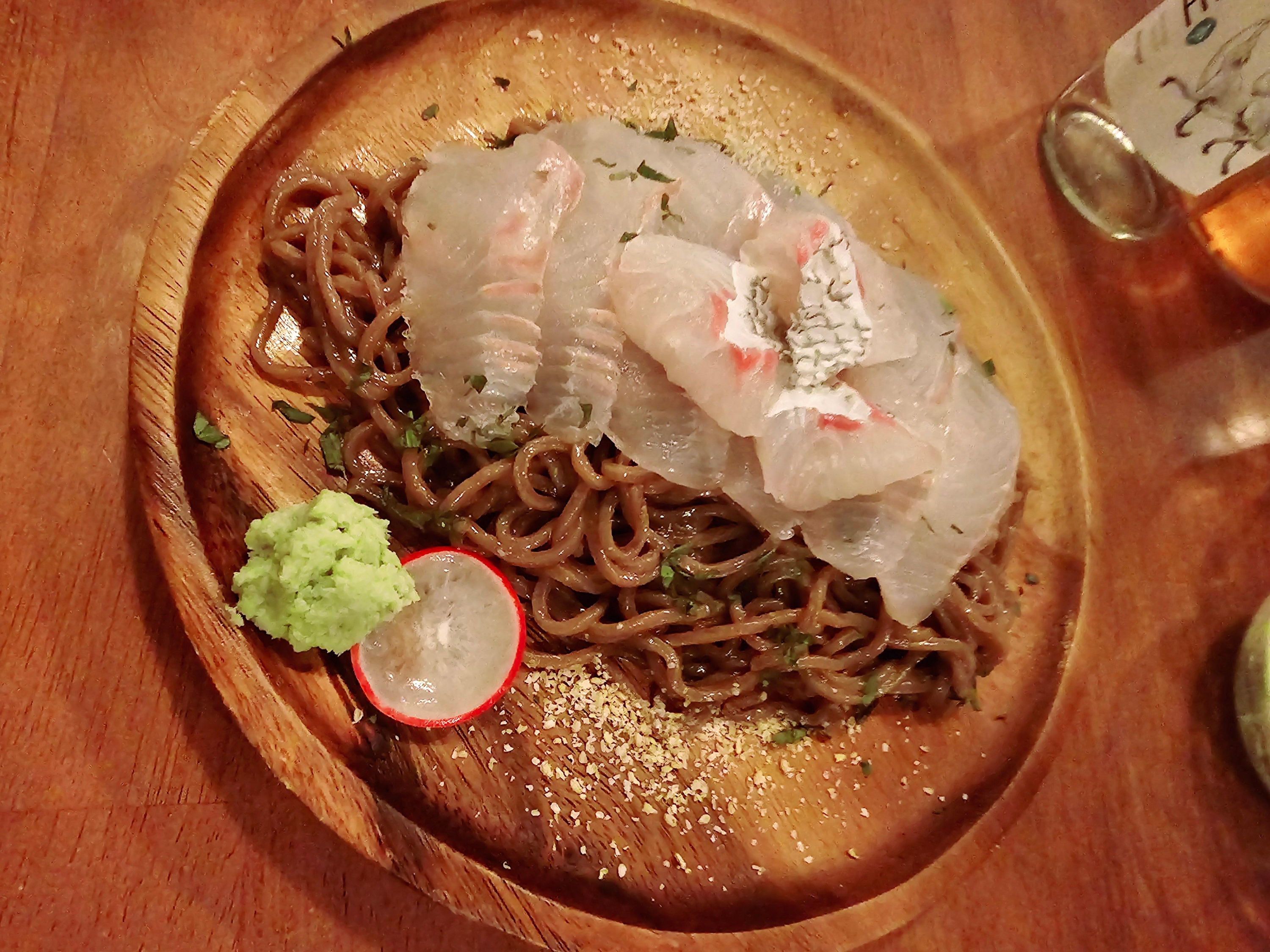 쫄깃한 소바면과 고소한 들기름 향, 신선한 흰살 생선회의 조화가 완벽해요.